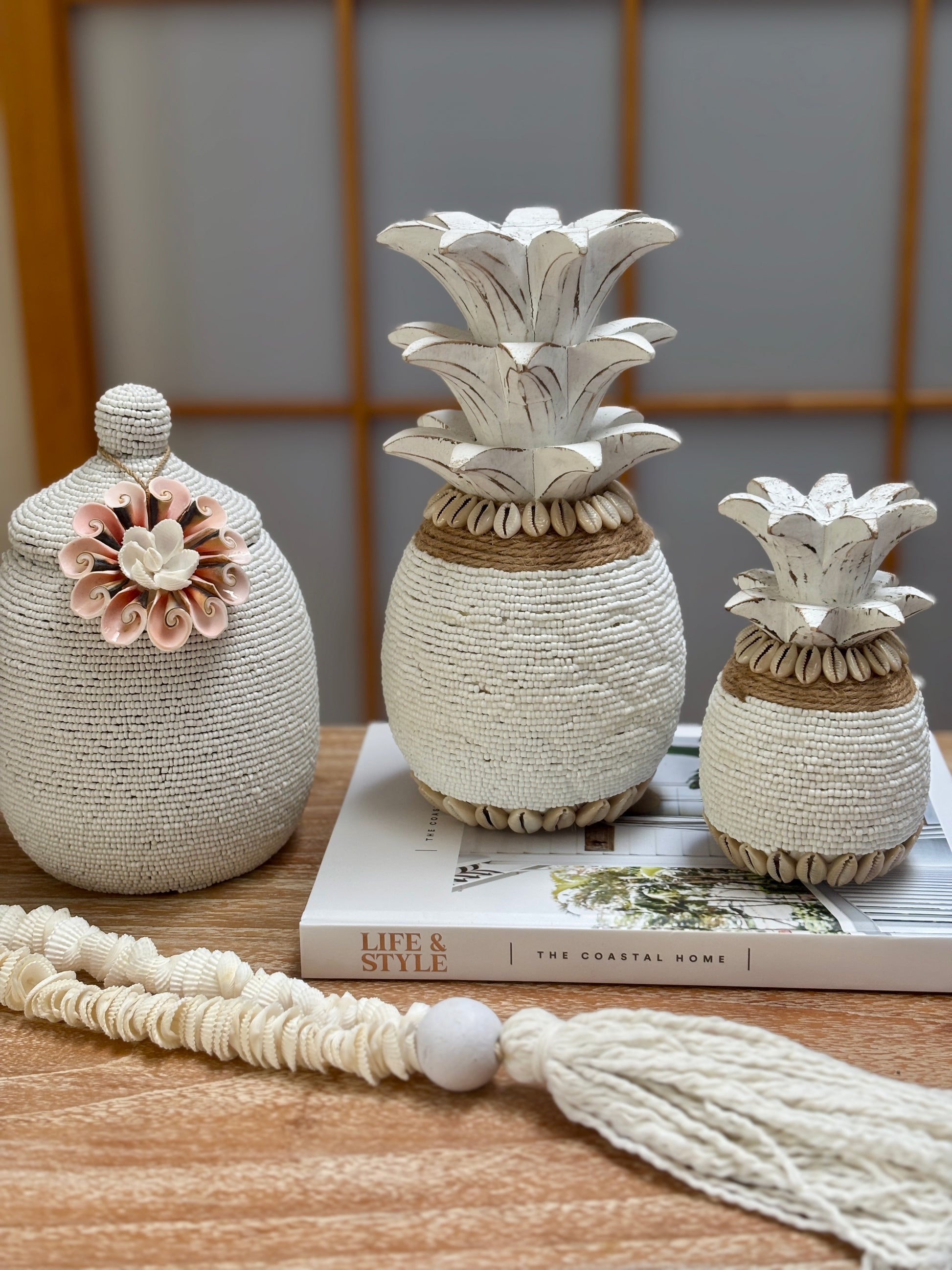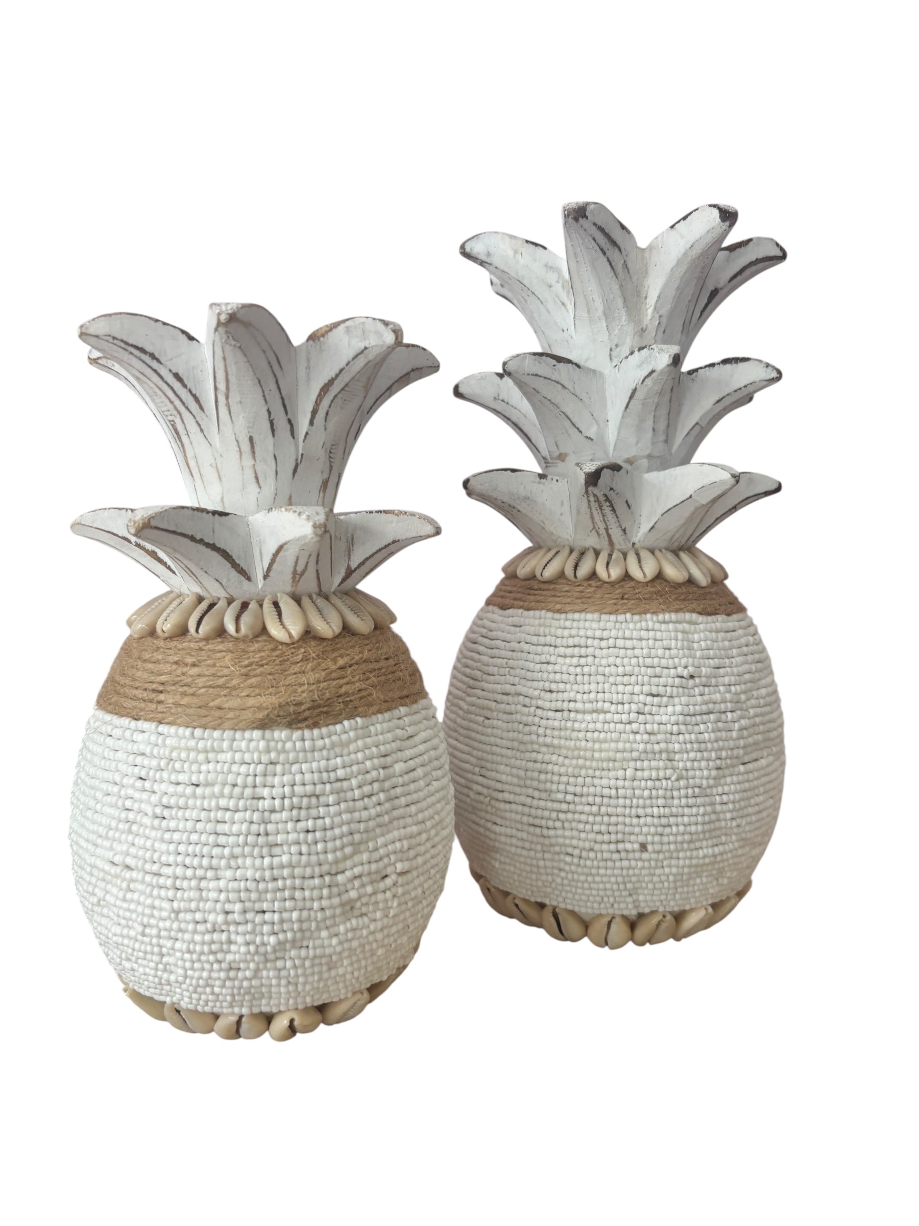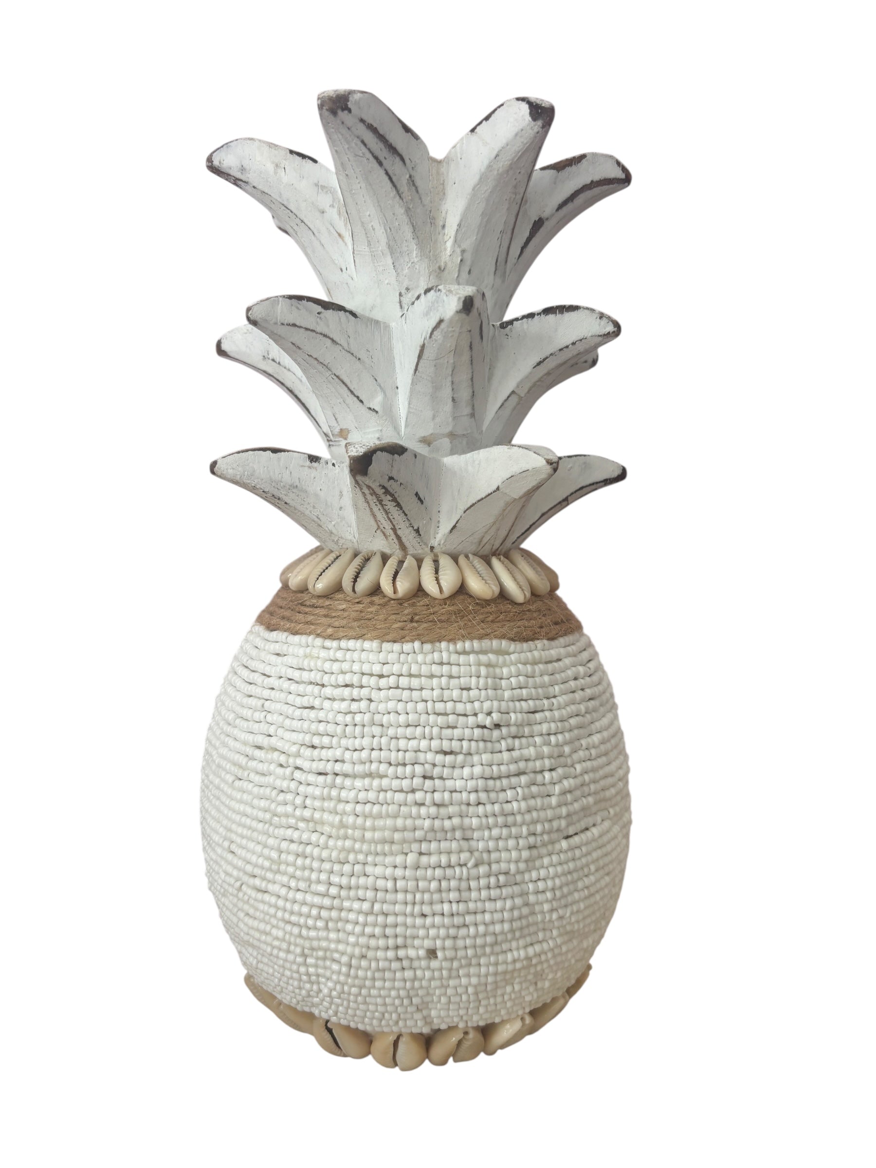 Add a tropical vibe to your home with this handcrafted decor pineapple made from recycled glass. Crown and base made from timber.