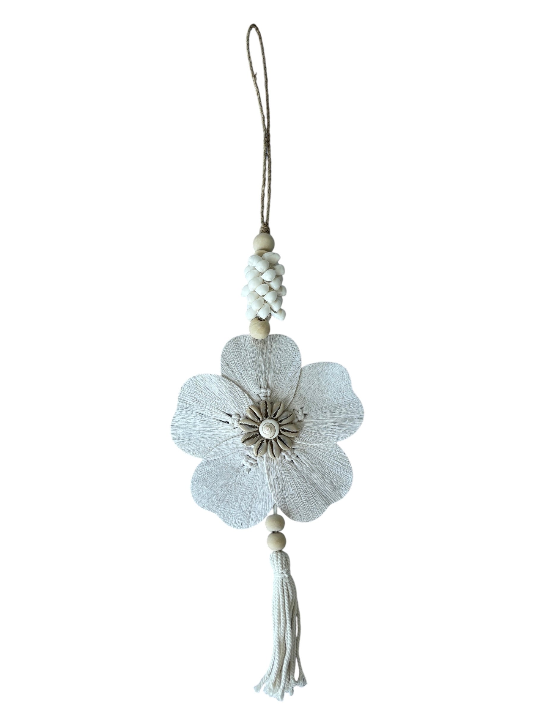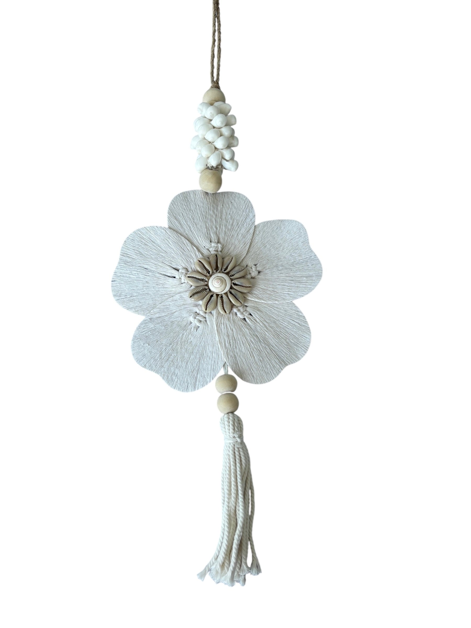 Enhance your home decor with our Frangipani Cowrie Tassel. Features intricately crafted macrame and delicate cowrie shells. Bring a touch of coastal boho into your home. Perfect for the wall or decorative piece around a vase or pot.