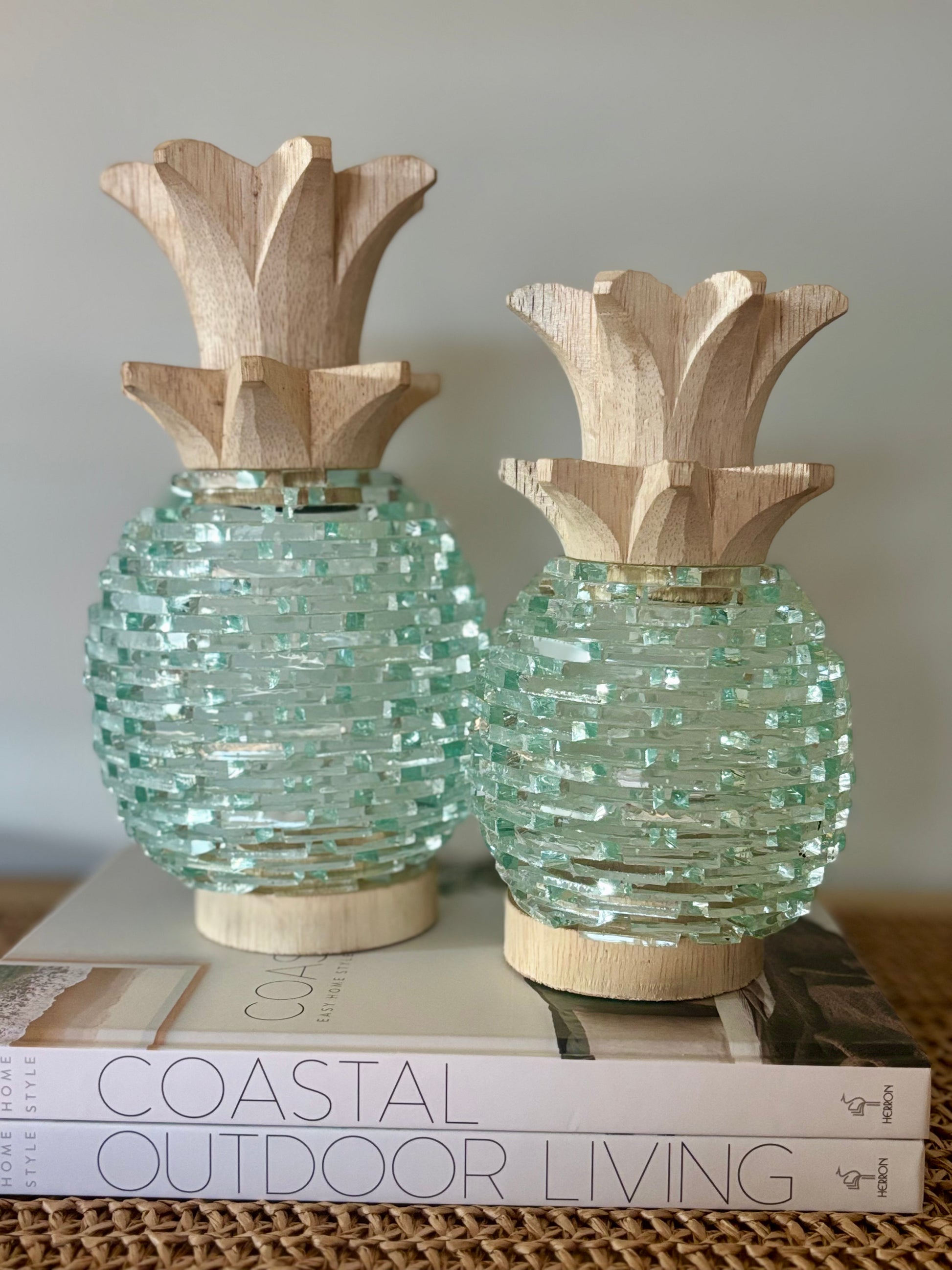 Add a tropical vibe to your home with this handcrafted decor pineapple made from recycled glass. Crown and base made from timber.