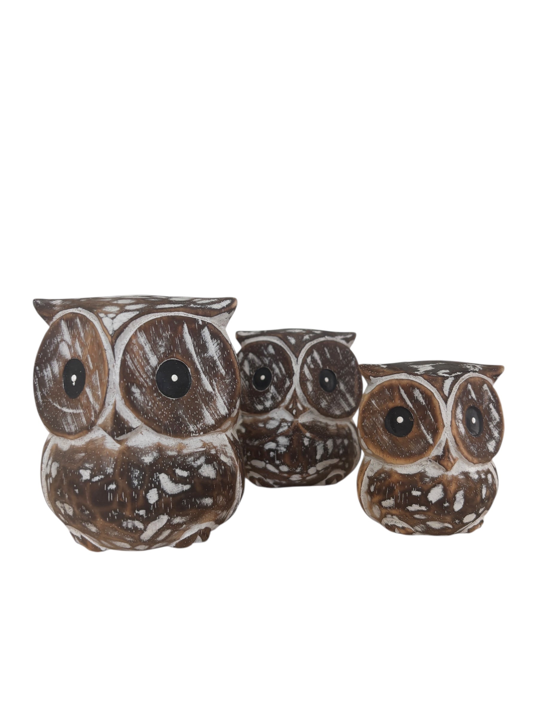 Cute little set of wooden owls, each one uniquely carved with intricate details and finished in a brown whitewash colour.