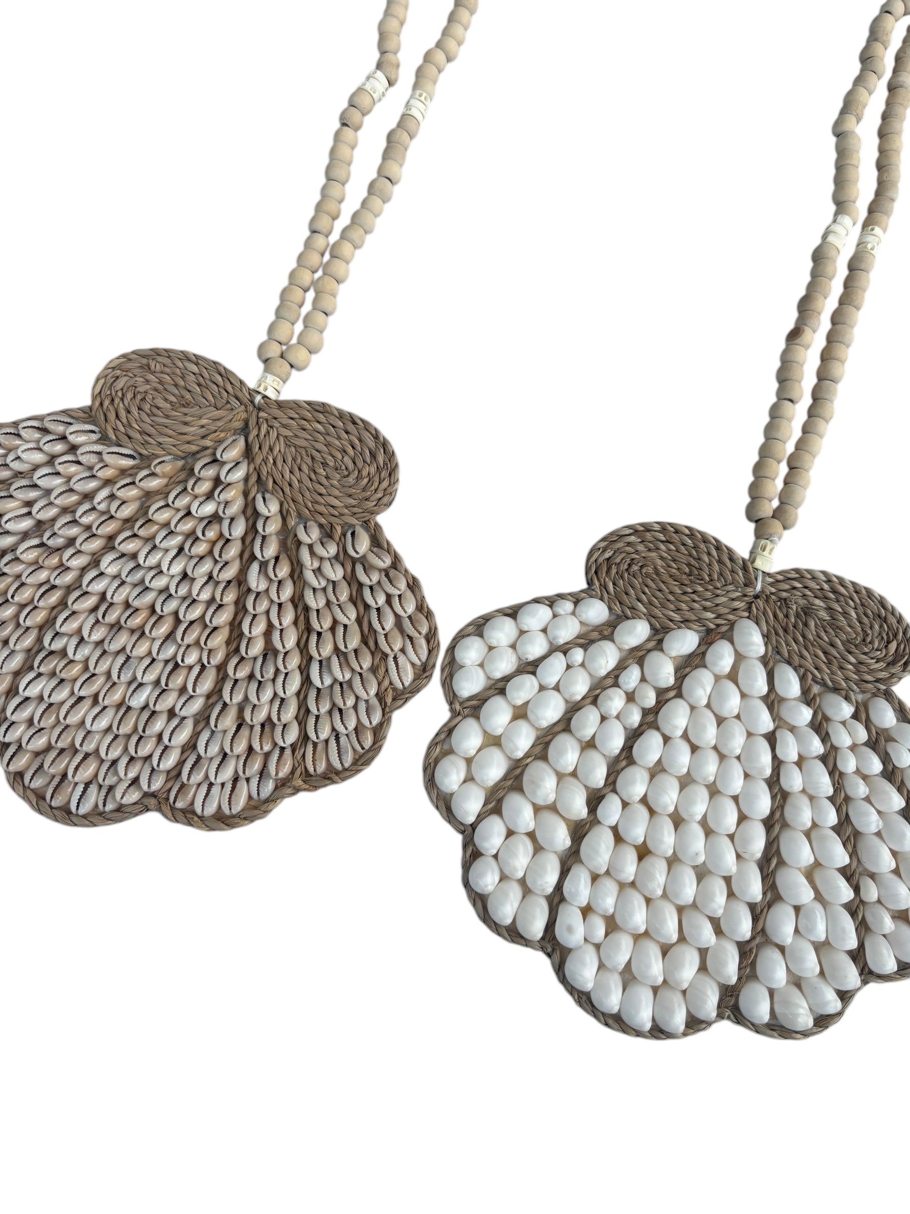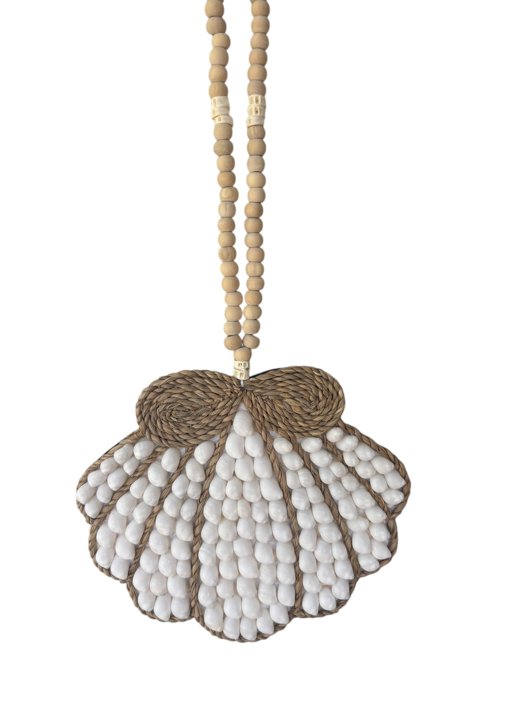 Beautifully handmade with white buteng shells and jute adorned with timber beading tassel.